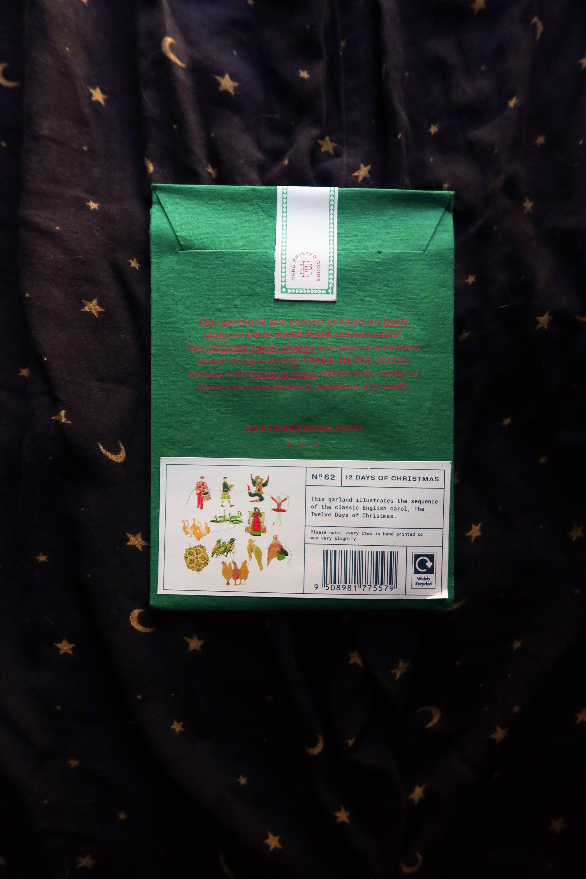 This garland illustrates the twelve gifts of the classic English carol, The Twelve Days of Christmas.