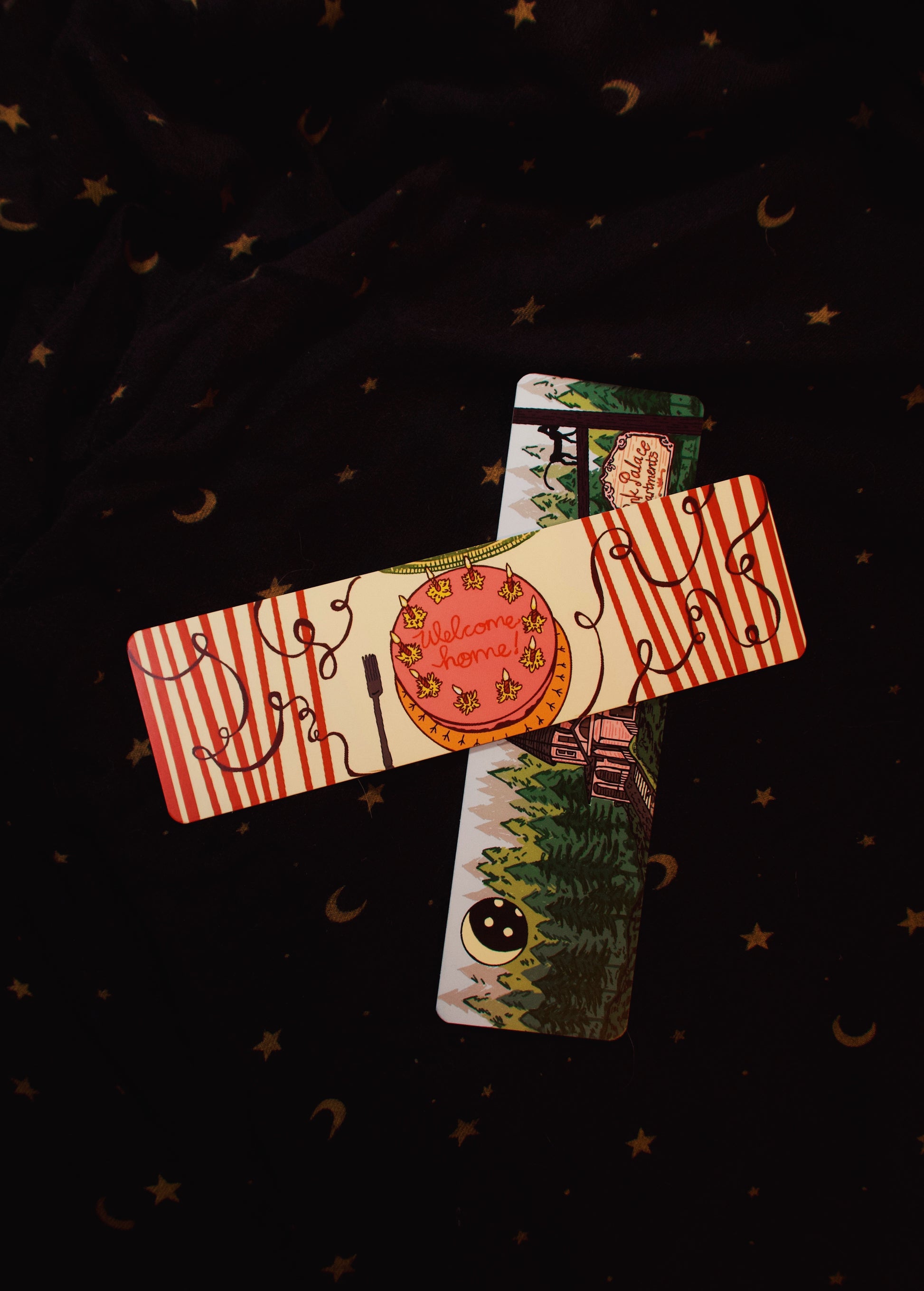 this bookmark set is inspired by the movie Coraline including 2 scenes and the pink palace scene, the welcome home cake scene.
