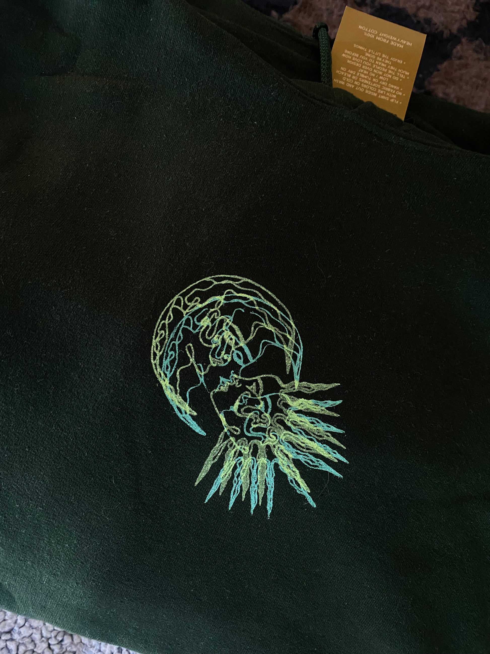 introducing your new favorite hoodie. this hoodie was a labor of love, from hand drawing the front design, to hand screen printing them myself in my small NYC apartment, each one made with attention to detail and care. Each hoodie features 4 elements to the whole design, the sleeve, the large quote on the back, the small livingluna underneath on the back and the front design. The design for this hoodie was inspired by mental health awareness and features a quote on the sleeve that is meant to keep your mind at ease and bring you back to the present. packaged in 100% sustainable and bio degradable materials.