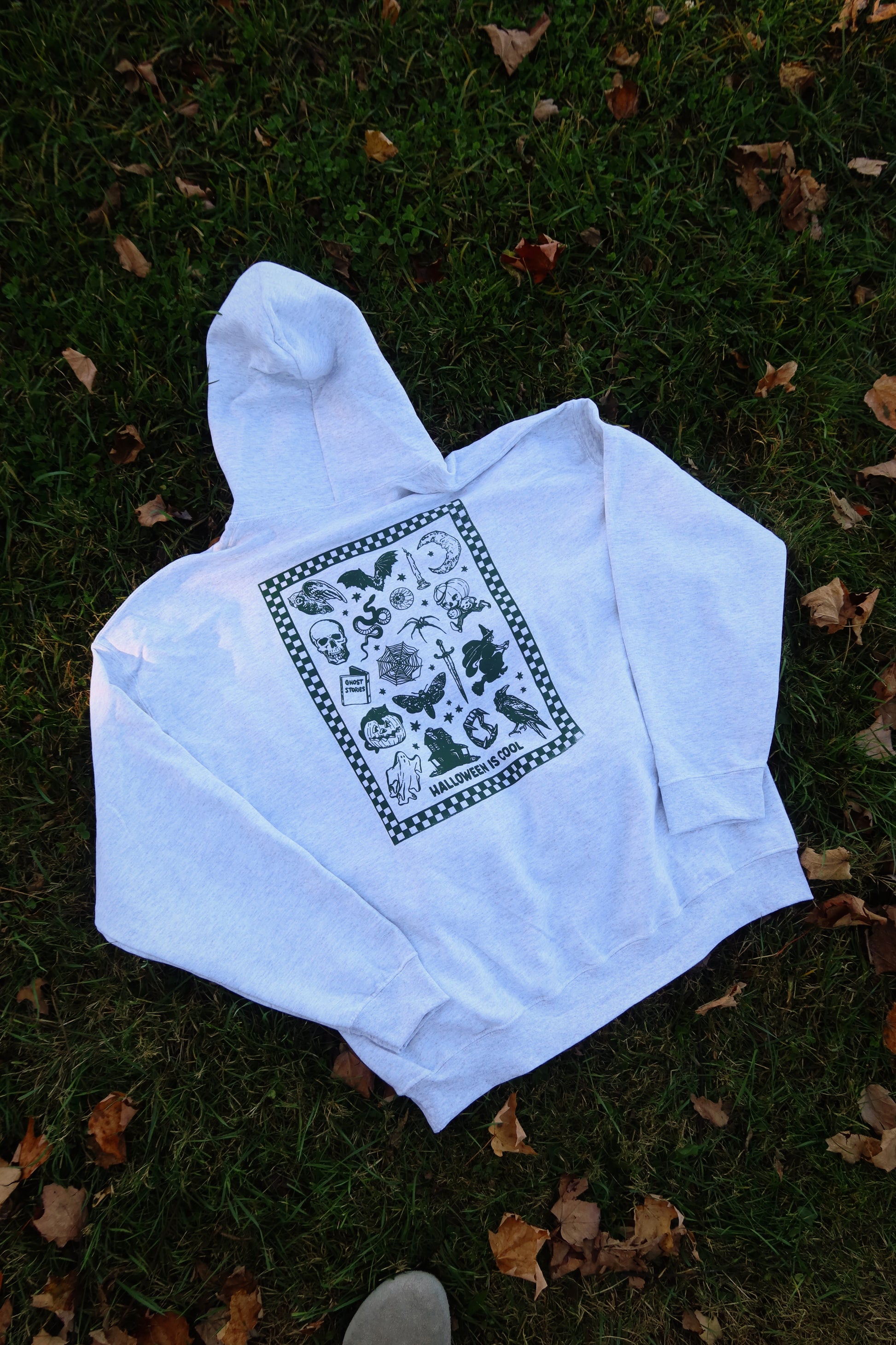 hand screen printed by me in my living room, your new favorite hoodie made from the comfiest material. Light gray hoodie with green ink.