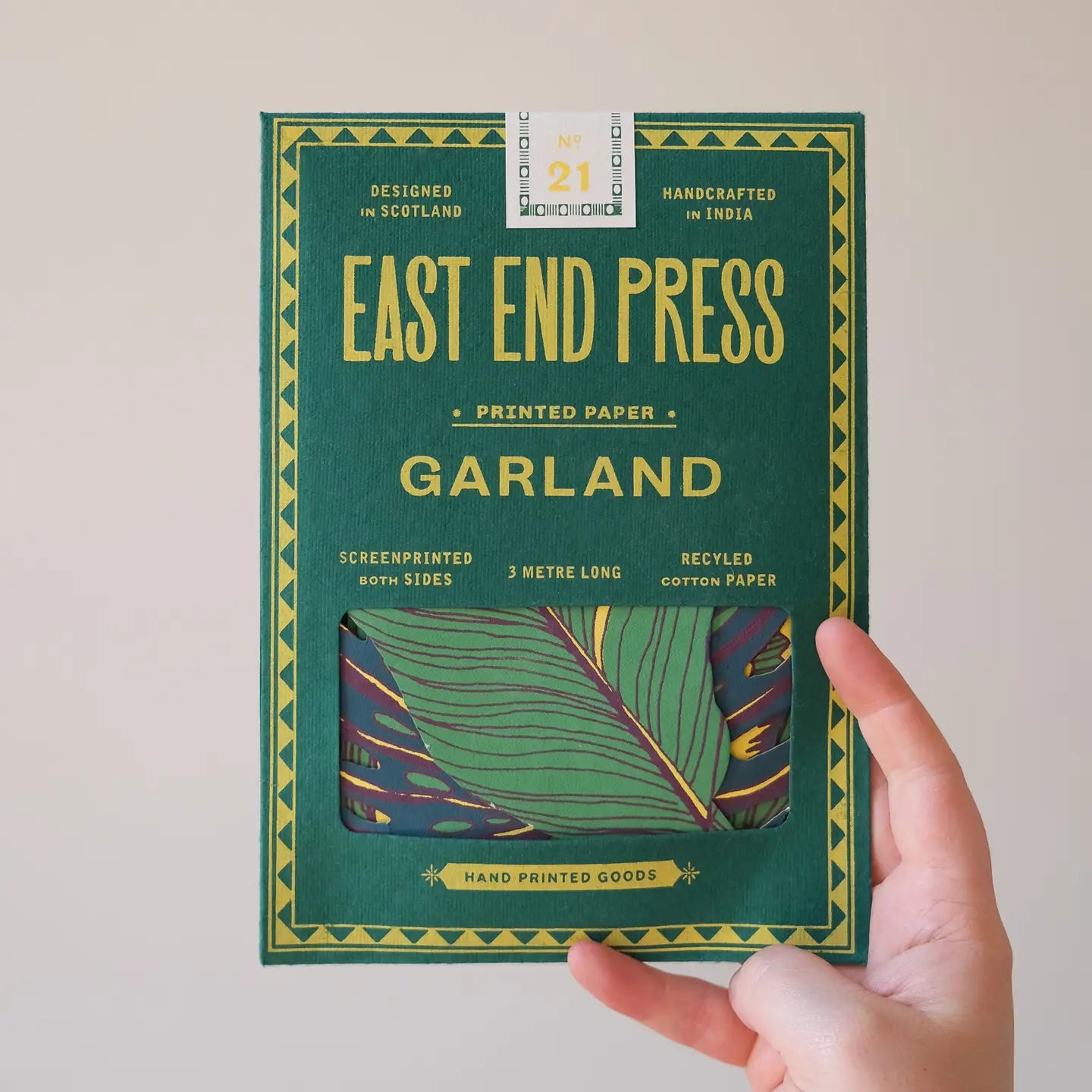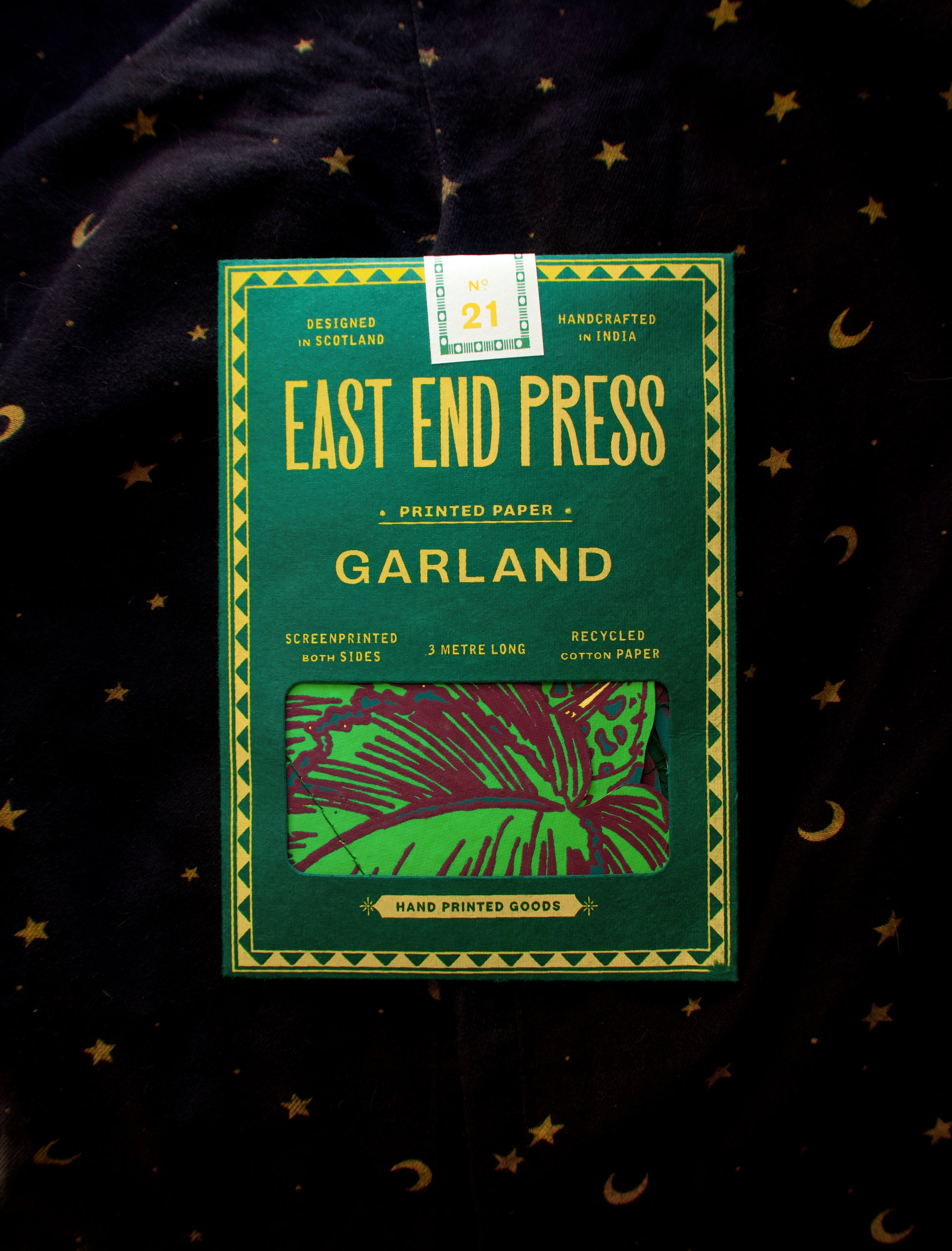 3 metres long - Includes 10 paper shapes, sewn along strong cotton thread - Screen printed by hand on both sides by talented artisans in Jaipur - Sustainably made from recycled materials