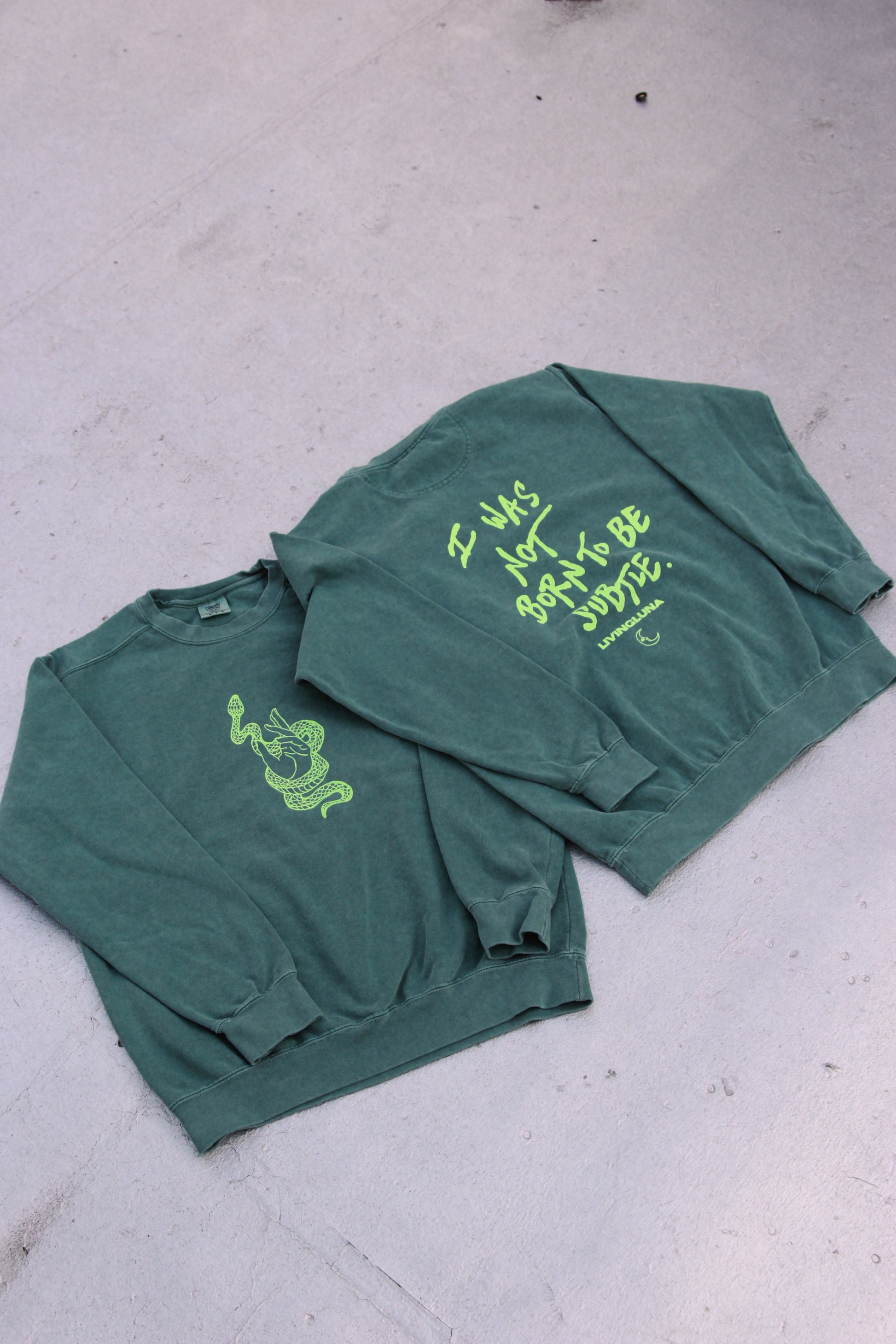 This hand screen printed crewneck is printed on unbelievably soft 100% cotton Comfort Colors sweatshirts with lime green ink.