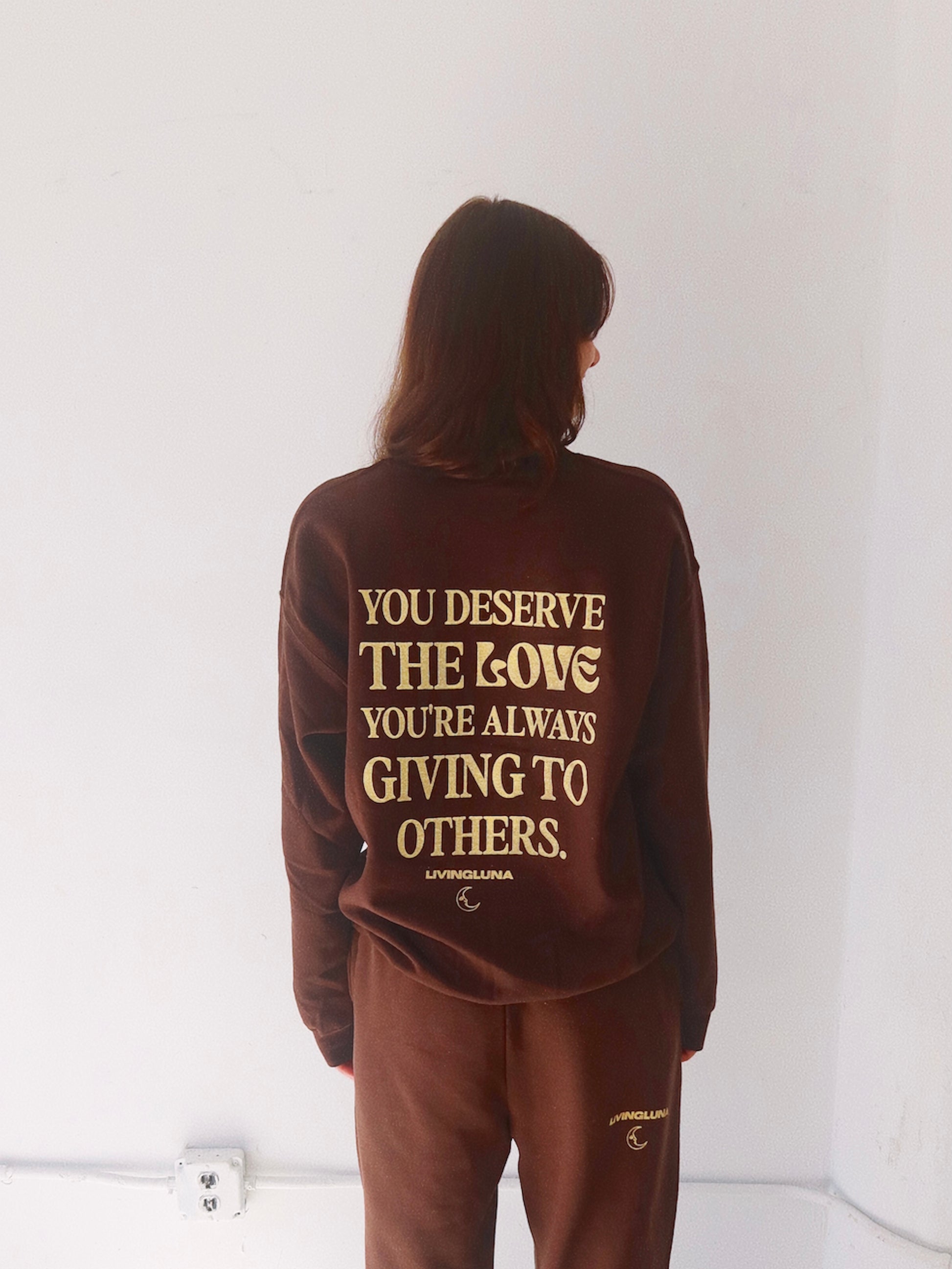 This limited edition crewneck is here just in time for valentines day. hand screen printed by me in my living room, your new favorite crewneck made from the comfiest material. each crewneck is screen printed 4 times for each element of the design, the sleeve, the front, the back quote and the logo underneath. Brown crewneck with pastel yellow ink.
