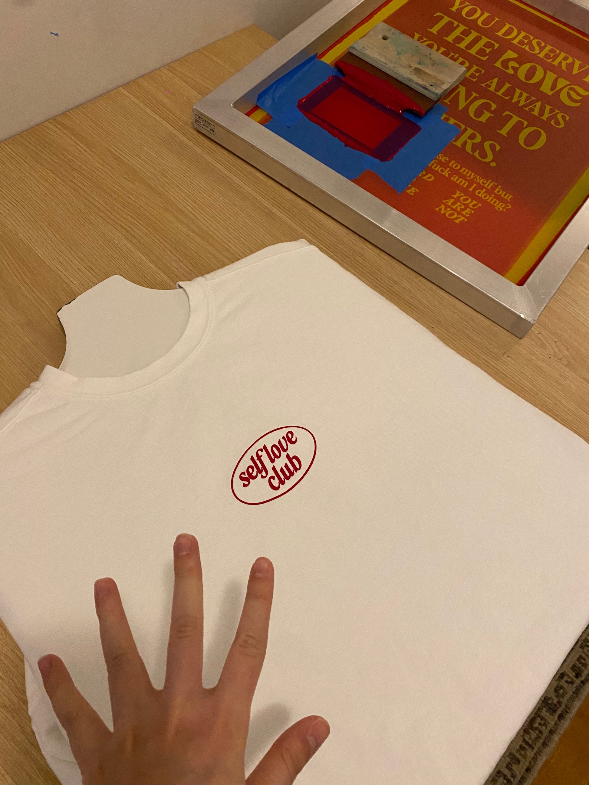 This limited edition crewneck is here just in time for valentines day. hand screen printed by me in my living room, your new favorite crewneck made from the comfiest material. each crewneck is screen printed 4 times for each element of the design, the sleeve, the front, the back quote and the logo underneath. ivory crewneck with maroon ink.