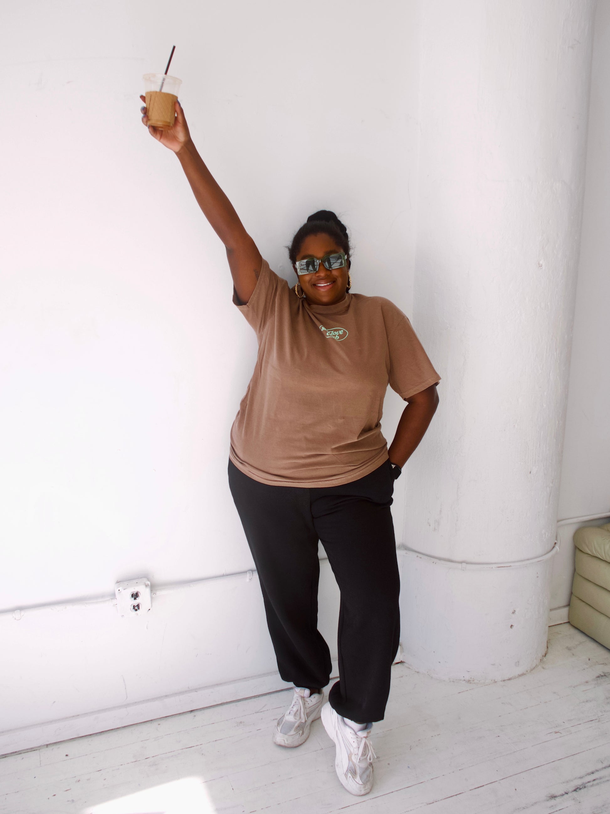 your new favorite tee made from the comfiest material. espresso brown washed shirt with mint green ink.