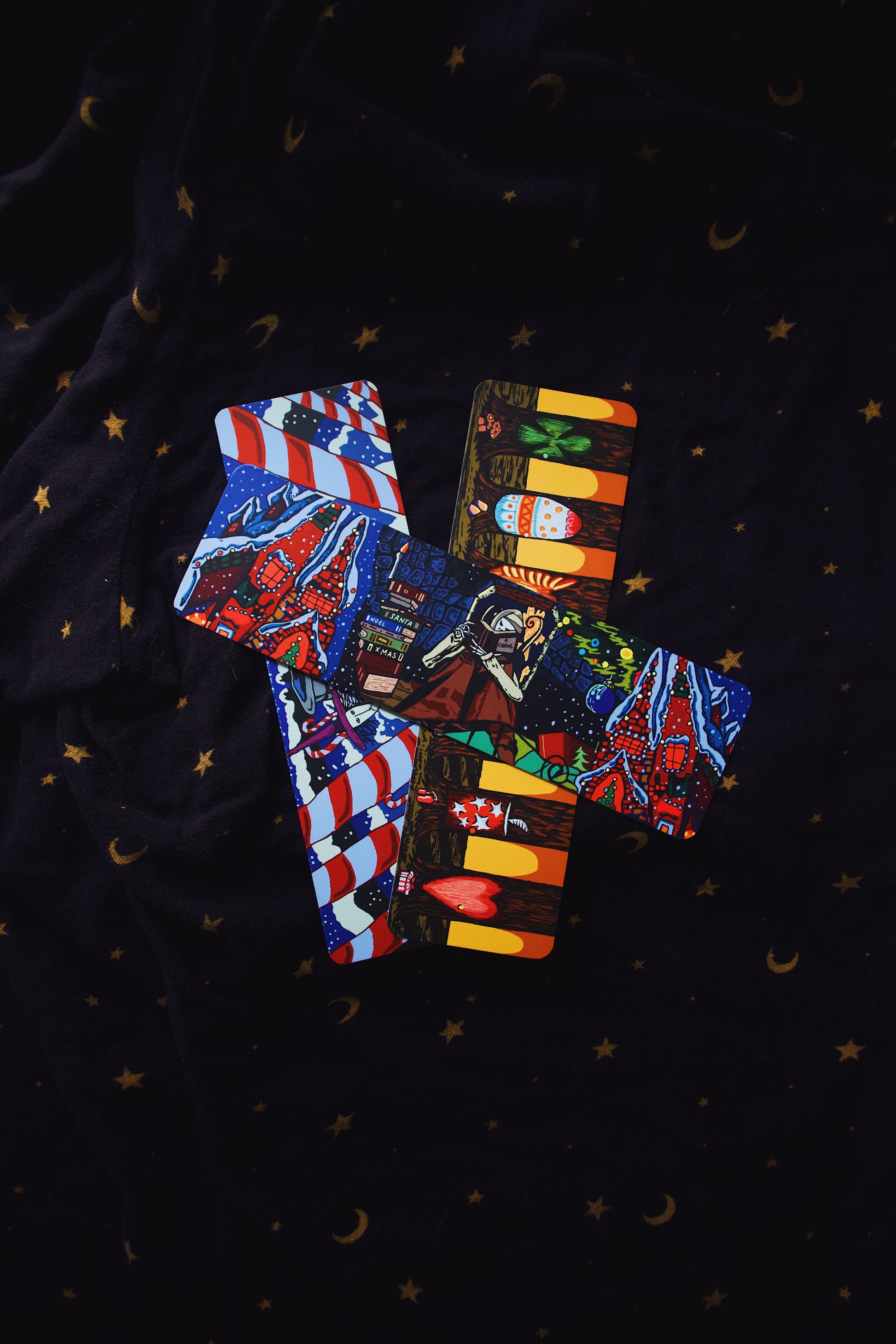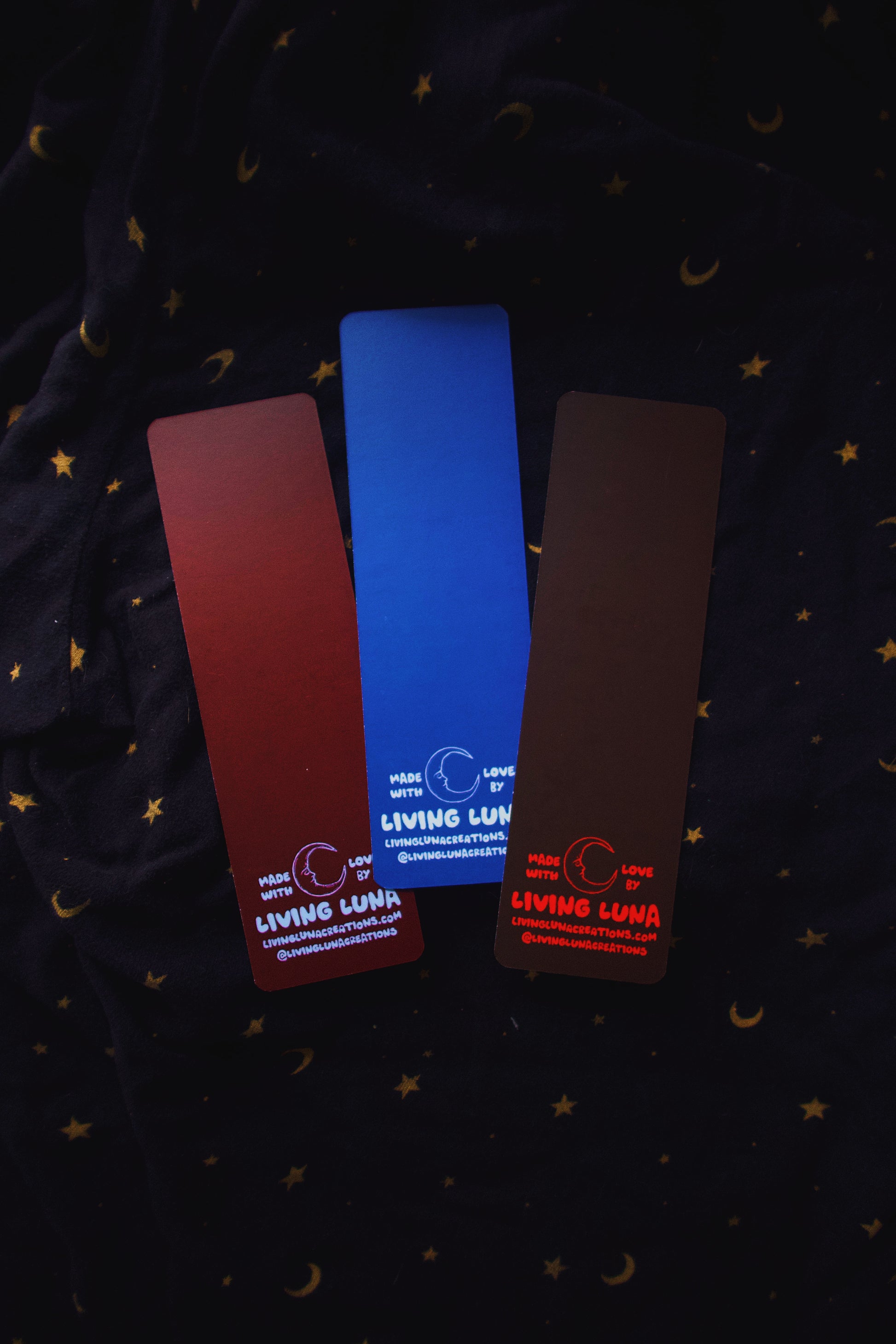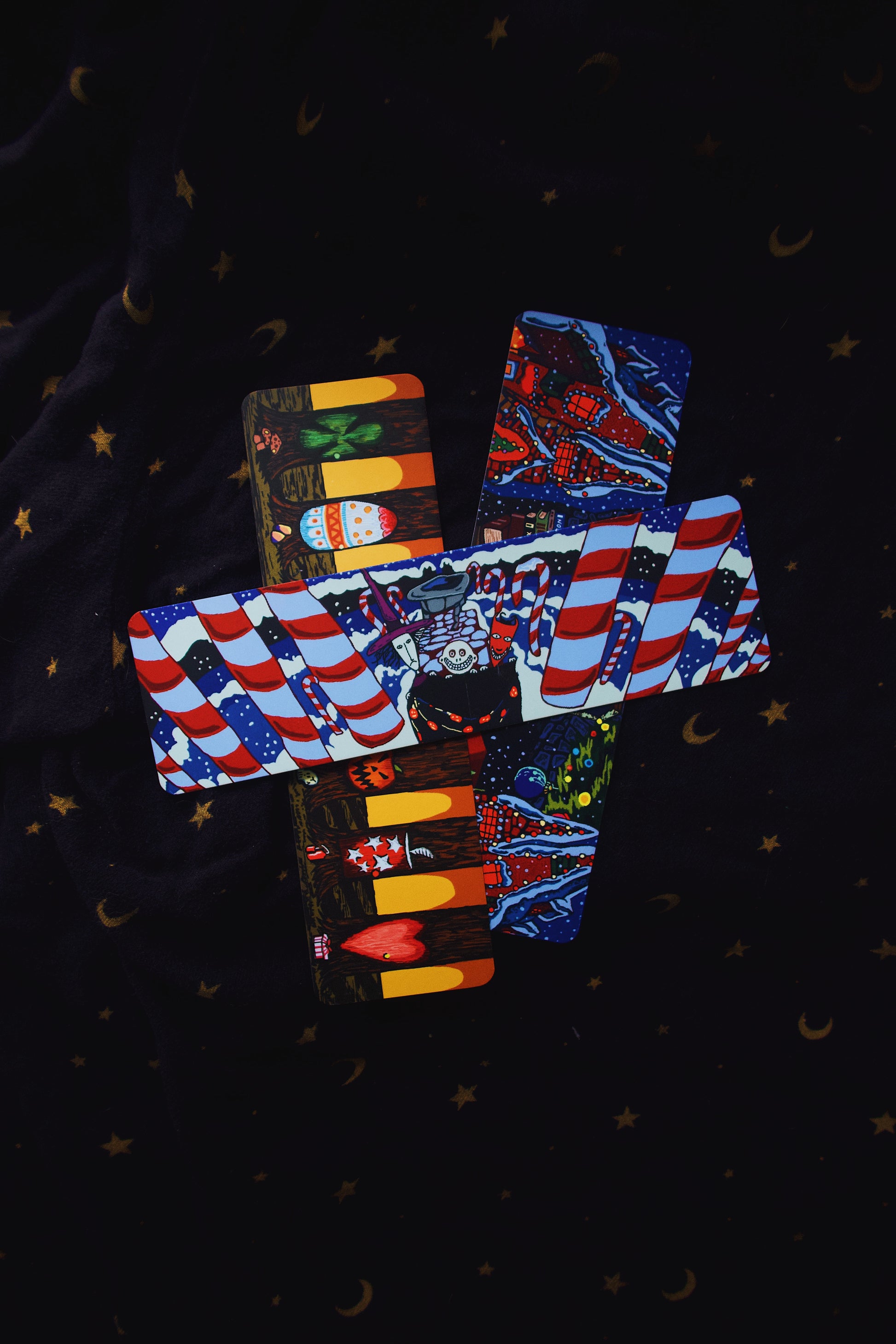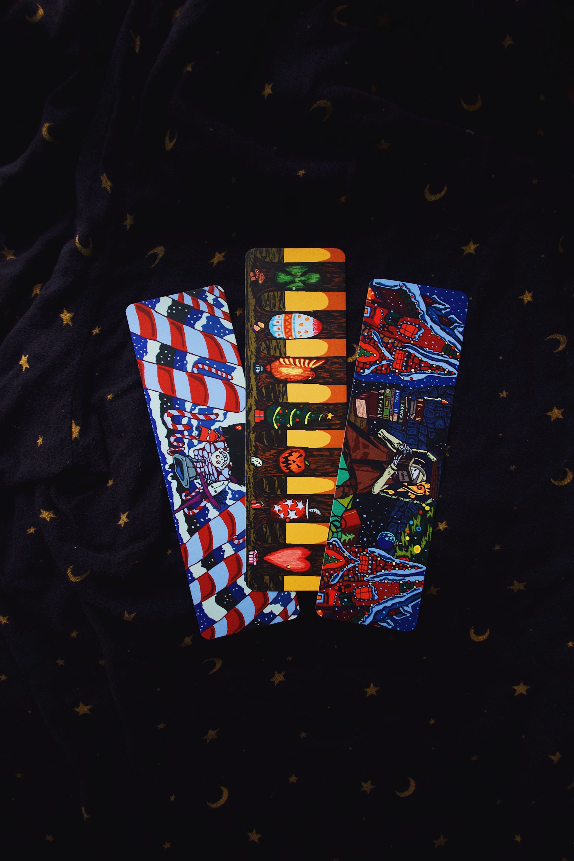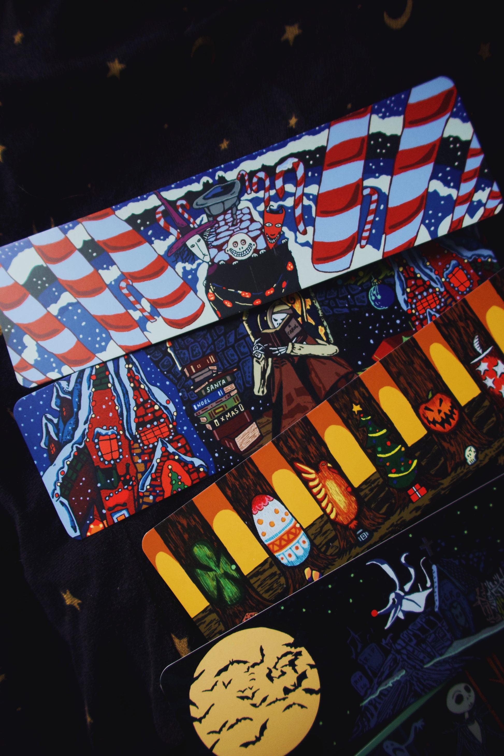 this bookmark set is inspired by the movie The Nightmare Before Christmas showcasing 3 scenes including the trees for each holiday, the triplets abducting santy Claus, and jack learning about Christmas.