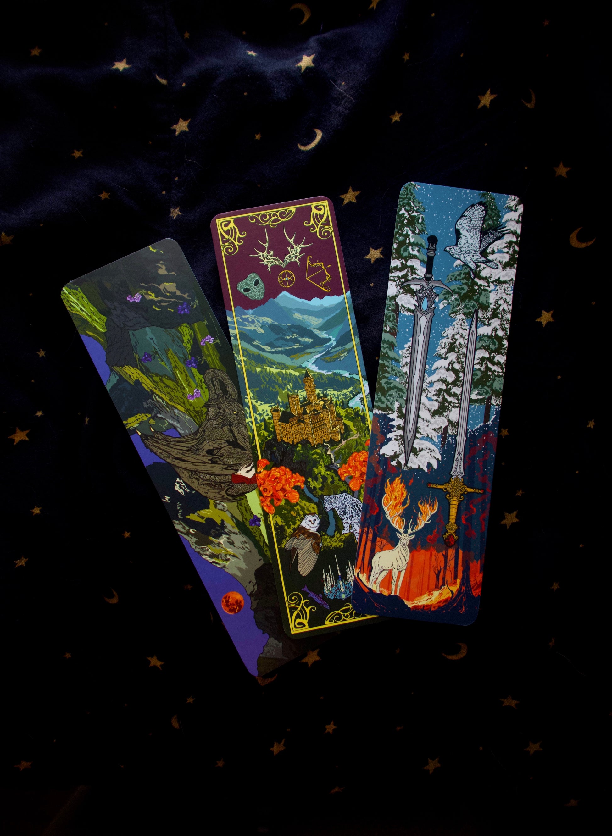 this bookmark set is inspired by the book series Throne of Glass including the Thirteen and Abraxos bookmark, the Terrasen bookmark, the Rowan and Aelin bookmark. Slight pixelation is normal in these designs as they were drawn by me digitally on procreate.