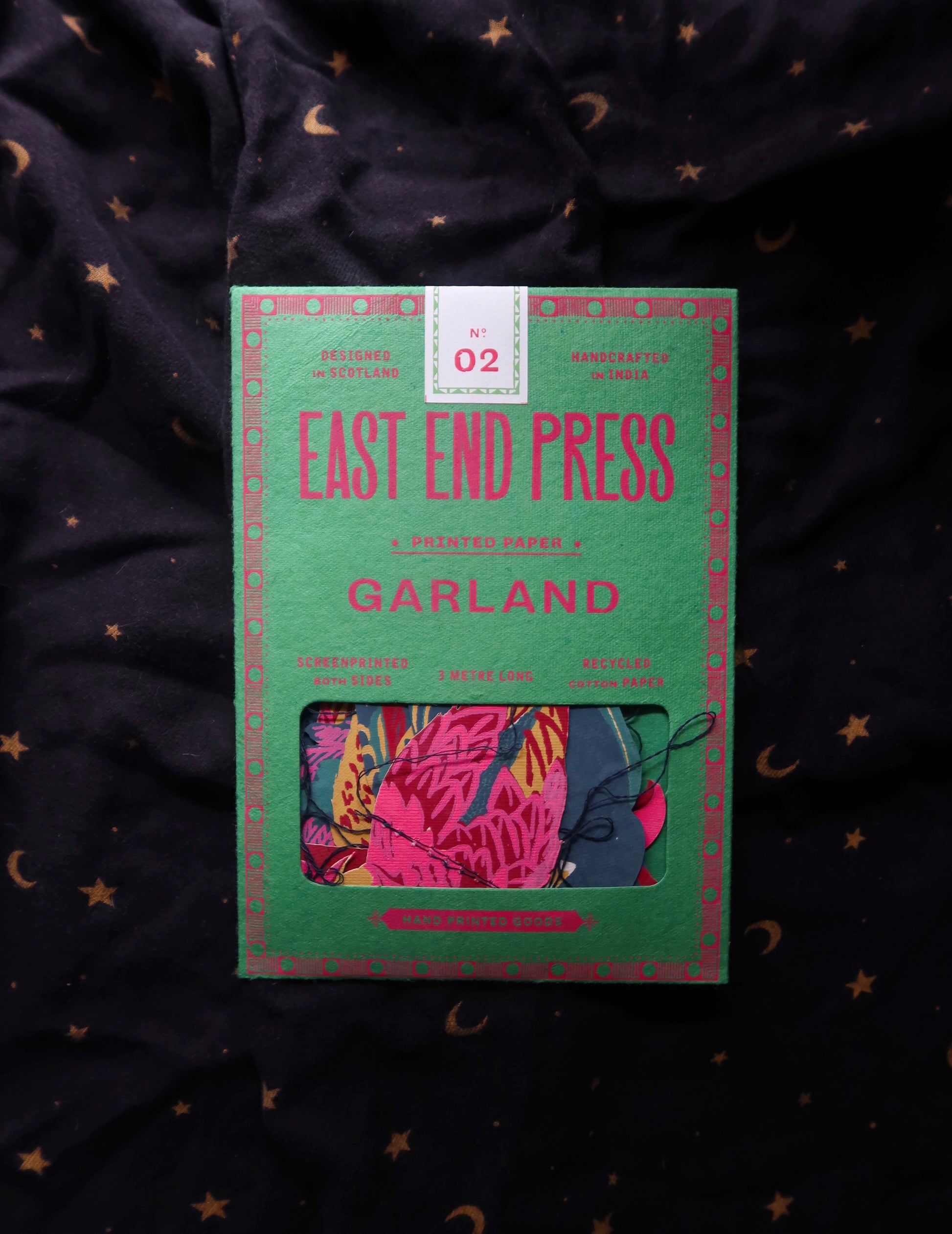 3 metres long - Includes 10 paper shapes, sewn along strong cotton thread - Screen printed by hand on both sides by talented artisans in Jaipur - Sustainably made from recycled materials