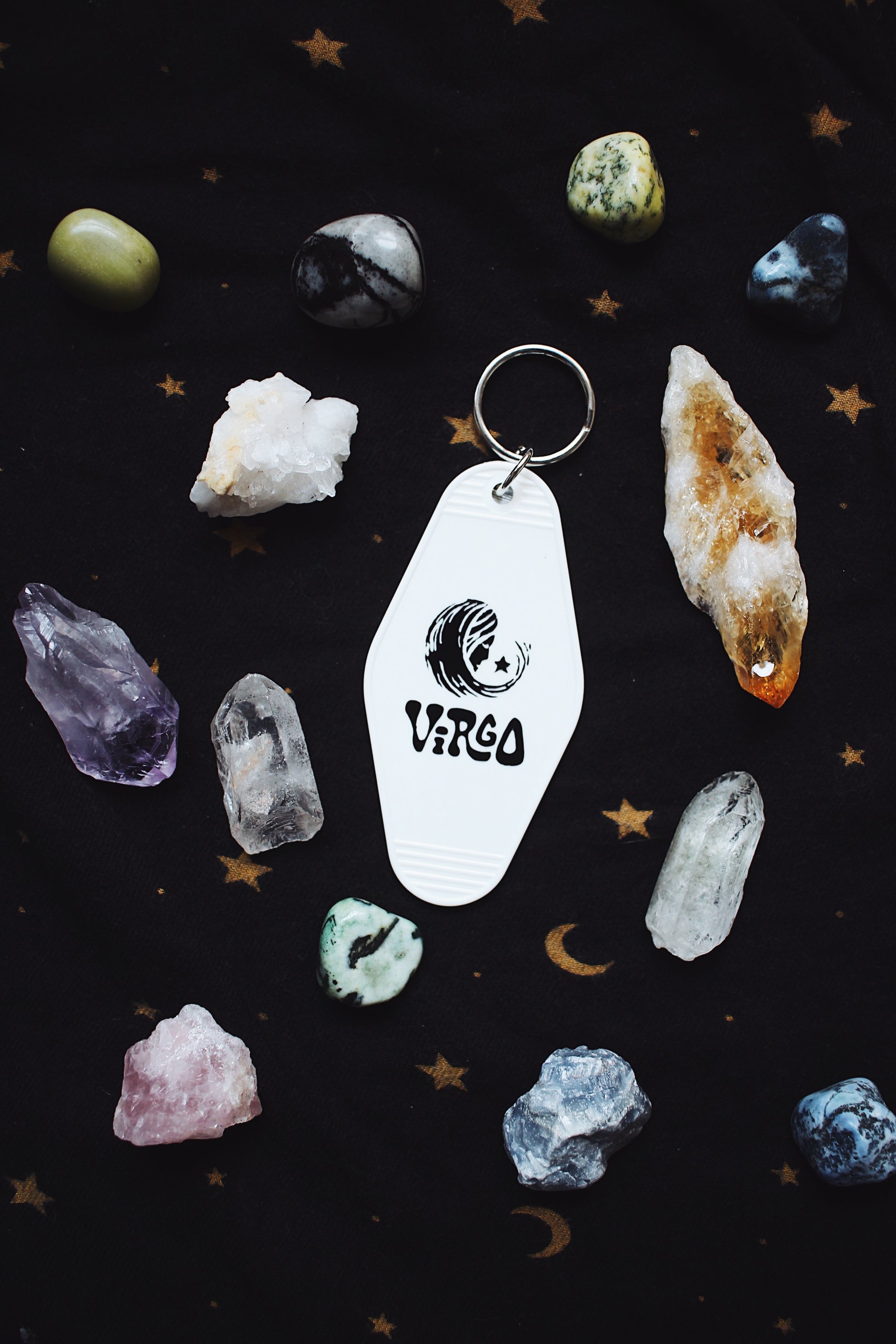 for all of the keychain lovers out there, this one's about to be your new favorite. making it personal to you, because you should feel like what you buy was made for you, the virgo zodiac sign key tag is inspired by the classic design of vintage motel keychains.